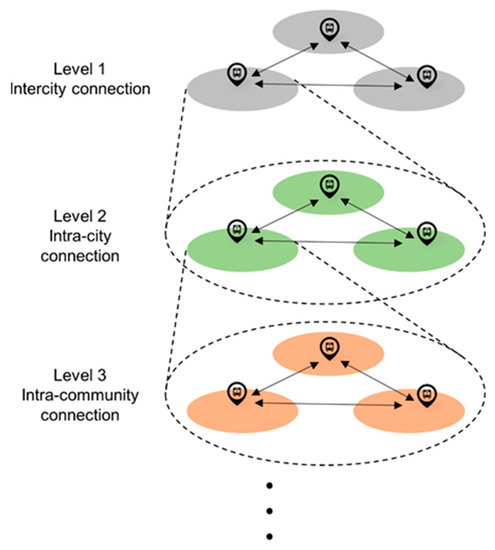 Here, a heuristic algorithm for this problem is provided. A CB system layout with hierarchical service scopes is designed (see Figure 2). Commuting demand in the urban agglomeration is a combination of demand from multilevels. In order to serve the demand from different levels, as shown in the figure, the commuting CB system is designed to have multiple levels, including intercity connection (level 1), intracity connection (level 2), intracommunity connection (level 3), etc. In each level, the city regions are split into densely connected communities as the service scope. Each service scope possesses a single CB station that CB lines can be deployed to connect the service scopes. Taken each service scope into consideration, it can be divided into multiple smaller and more densely connected communities as subservice scopes in the sublevel. Moreover, CB stations and CB lines in the sublevel can be deployed and connected using the same method. In each level, the CB system mainly serves the transportation demand between different scopes at the same level, and the transportation demand inside each service scope is served by the sublevel CB service.