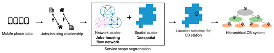 This paper introduces a CB system layout design and develops a network-based hierarchical location selection method based on the jobs-housing relationship from mobile phone data. The rest part of this paper is organized as follows—hereafter this section, this paper reviews the related works from the literature and describes the overview of the CB system and the basic rules of the service scope division and station location selection; Section 2 presents the detailed methodology of this work, including the iterative algorithm of generating service scopes and station location; Section 3 presents the result of the case study in Yangtze River Urban Agglomeration in China; Section 4 proposes the conclusions and the future prospects of this study.
