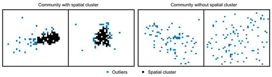 Since the community detection method is conducted without adjacency constraints, the subcommunities divided by the community detection can be spatially discrete. To avoid that, the DBSCAN algorithm is applied to identify spatial clusters for the community and rule out the communities without spatial clusters. DBSCAN is a classic density-based clustering algorithm [40]. This method performs clustering based on the density of the dataset in the spatial distribution. It can automatically determine the number of clusters and effectively process clusters of any shape. Given a threshold for the number of neighbors, minPts, and the radius, ε, objects with more than minPts neighbors within radius ε are considered to be a core point. All neighbors within the ε radius of a core point are considered to be part of the same cluster as the core point (direct density reachable). If any of these neighbors are also a core point, their neighborhoods are transitively included (density reachable). Noncore points in this set are called border points, and all points within the same set are density connected. Points that are not density reachable from any core points are considered to be outliers.