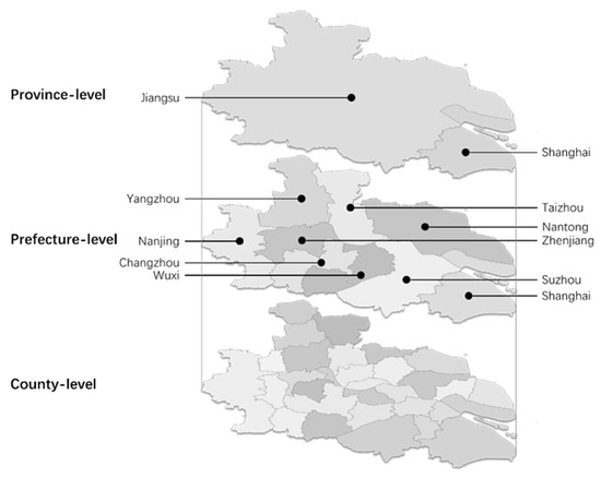 The study area in this study is the Yangtze River Urban Agglomeration in China, one of the largest urban agglomerations in the world with a population of over 70 million (Figure 5). It is one of the regions with the best economic development and the strongest comprehensive competitiveness in China. The study area is in the jurisdiction of two province-level administrations (Jiangsu Province and Shanghai), subdivided into one municipality directly under the central government (Shanghai) and nine prefecture-level cities. Since conflicts of interest between different districts can barely be moderated or coordinated, it is impossible to acquire complete and consistent datasets from different districts.