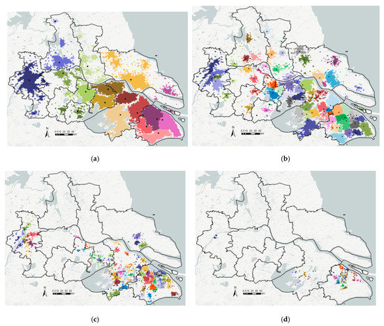 The selection of parameters minPts and ε will influence the clustering results. Here, the data is aggregated into 500 m × 500 m mesh grids as the nodes in the network community. In order to perform DBSCAN on network communities, the center of each grid is regarded as the position of the grid. The minPts are set as 10 points and the radius ε is set as 1 km, meaning that a grid will be considered as a core point if there are over 10 neighbors within 1 km. Figure 4 shows an example of the identification of spatial clusters in four network communities. Under this set of parameters, DBSCAN can distinguish if there exist any spatial clusters in the community.