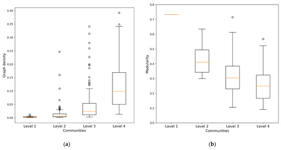 In the network analysis, a community is a collection of highly interconnected nodes [38]. The nodes belonging to different communities are sparsely connected. Community detection is the method to divide the network into densely connected communities. Modularity is an indicator between −1 and 1 that measures the density of links inside communities as compared to links between communities, which is widely used as the objective function in many community detection solution algorithms. It is defined as Equation (2):