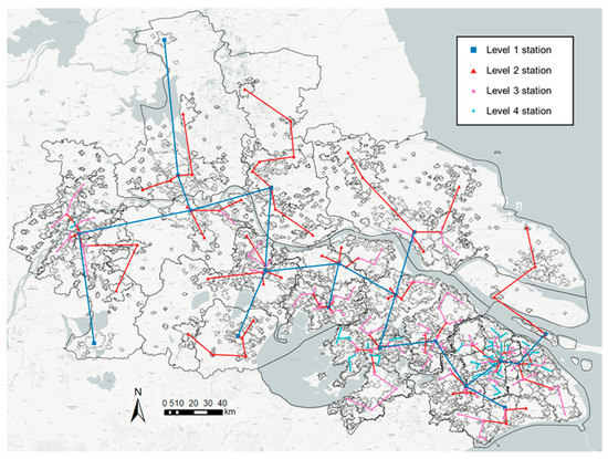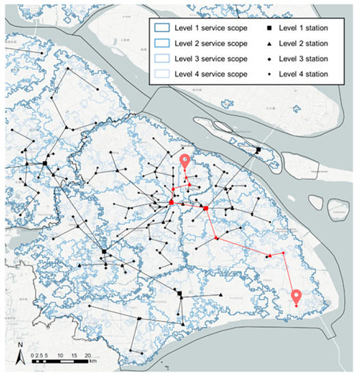 Figure 11 shows an example of a commuting trip served by CB network, i.e., a commuter with the origin and destination in Nanhui New City (Southeast part of Shanghai) and New Jiangwan City (Northeast part of the central urban area in Shanghai), respectively. These two areas are covered by level 3 service scopes under different level 1 parent nodes. The commuting path passes through level 3, level 2, and level 1 nodes to another level 1 node and then to level 2 and level 3 leaf nodes within its scope. Under this hierarchical form of node connection, the whole area is effectively connected.