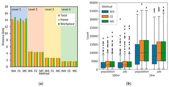 Figure 10a shows the average travel distance between the demand p and the station location determined by the three methods proposed. Figure 10b shows the comparison of the number of population and job opportunities within 500 m and 1 km buffer areas surrounding the three types of stations.