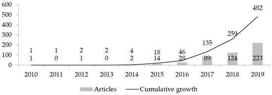 The original basic search (663 items) is classified using different types of publications; refining later into 482 articles which are the collection obtained to acquire the results in the present study. Proceedings papers, book chapters, and other types of results were discarded, to focus on a uniform set of data. Due to the current appearance of the subject of study, a criterion of quantifying all available information since there are records for this topic (2010, in this case) is used. For that reason, this paper presents some articles included in the study, that were not published in scientific journals, from FORBES and FORTUNE business magazines and ten edited books. It must be added that there was no language restriction in the search made. Even though almost all the articles found were written in English, some exceptions were in Spanish (16), Portuguese (eight), German and Polish (two each), Croatian, Korean, Slovenian, and Turkish (one each).