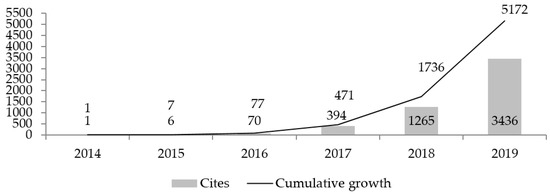 Regarding citations, it is in 2015 when the Airbnb phenomenon begins to show a growing interest (Figure 2), as there has been only one citation before that year. The cumulative growth of citations presents a substantially more pronounced increase than the published articles as it is shown in Figure 1: 738.85% versus 26.77%, respectively, from 2015 to 2019. It should be clarified that this difference is expected due to the “virality” that allows the citation of multiple articles within another. Despite that, Figure 2 still graphically highlights the moment of expansion in the Airbnb phenomenon interest that is being currently experienced.