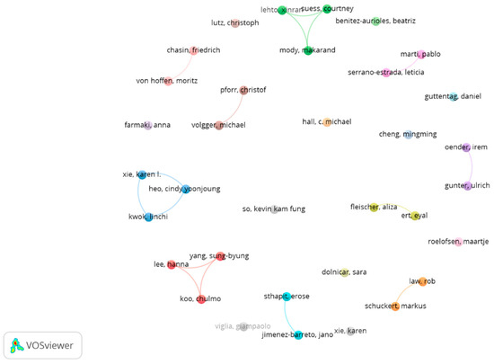 In Figure 3, and using VOSviewer, an analysis is presented about the co-authorship of the articles selected, that is, the degree of relationship among those who share authorship within the works under study. A full counting method is used for this, in which the authorship weight of a link is not fractionalized by the co-authorship of the documents. To obtain a significant sample, it is filtered by a minimum of authors who have made at least three articles—and not four, as in the previous criterion—and, in addition, it is considered that these authors have been cited at least ten times within WoS, obtaining 34 of them that fulfil those conditions, displaying as a total link strength representation (Figure 3). A low level of the relationship among them is highlighted. Only noteworthy, are the three groups of three members each formed by Mody et al. (in the line of comparing Airbnb and hotel accommodations), Xie et al. (consumer’s satisfaction, valuations and perceptions), and Lee et al. (consumer behaviour and social media). Figure 3 also shows six pairs of authors, in which Airbnb’s valuation determinants (Günter and Önder) and the study of online reviews and ratings (Schukert and Law) highlights.