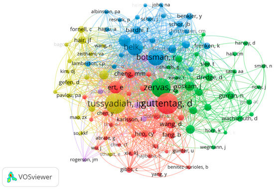 The co-citation analysis is shown in Figure 4. In this case, the relatedness of all authors who have been cited together on twenty occasions—to obtain an easy handling sample—at least, is also reflected through a full counting method, and previously excluding non-author items such as Airbnb, Price Waterhouse Coopers (PWC), Airdna, and Organisation for Economic Co-operation and Development (OECD). Once this is done, 105 authors in total are obtained, among which Guttentag, Tussyadiah, Belk, Bostman, and Zervas highlight. It can be observed that similarities with the study of sustainability in collaborative economy by Ertz and Leblanc Proulx [47] exist. Both studies present Belk and Bostman as one of the main pair of authors, as they represent the inception of sharing economy and collaborative consumption in the decade of the 10s with [6,7], respectively. On the contrary, the present study shows the more middlemost importance of Guttentag, Zervas, and Tussyadiah than Ertz and Leblanc Proulx [47], reflecting a peripherical position in its co-citation analysis, reflecting an increasing relevance of these authors for the 2018–2019 period.