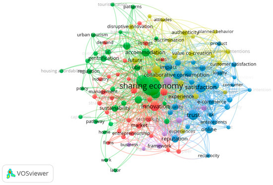 Finally, Figure 5 analyses the co-occurrence of all the keywords included in the articles under study, excluding “Airbnb” in order to avoid redundant factors and present a more informative figure. The selection criterion is based on those keywords that have been repeated on six occasions at least, obtaining a total of 116 of them, as shown in Figure 5. “Sharing economy” stands out as the most prominent keyword in the article analyzed. Secondly, terms such as “innovation”, “satisfaction”, and “trust” occupy prominent positions in the keyword listing and can be highlighted as main research lines.