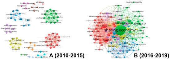 In a dynamic analysis, a comparison of two keyword co-occurrence networks for the 2010–2015 and 2016–2019 periods, respectively, and following the same criteria as in Figure 5, is presented in Figure 6. An equal part division in five years periods cannot be possible due to VOSviewer restriction regarding a minimum number of keywords. In the 18 articles collection obtained for the first period (A, Figure 6) can only be possible a maximum of one keyword co-occurrence. With a total of 78 keywords obtained, 13 differentiated clusters have been found. “Trust” keyword appears as the more preeminent one, keeping its importance along the present analysis. Several topics in A period (Figure 6) are very different to the analyzed “time banking”, “ride-sharing”, or “Internet of Things”. On the contrary, Figure 6B shows the 110 keywords obtained with the criterion that has been repeated on six occasions at least for the 2016–2019 period, keeping the main similarities in terms of keywords and clusters with Figure 5, showing that the last years are the more representative and influential of the total period of analysis.