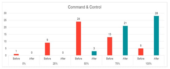 - Command and control (C2): There was an increasing knowledge of C2 after the course. Around 20% of the EPs (n = 10) had little or very little knowledge about C2, and 46% (n = 24) had medium knowledge. At the end of the course, there was a shift to the positive end, where the majority of our participants had a good to a very good understanding of C2 function (n = 49, 94%) (Figure 1). The change was statistically significant (p = 0.00, z = −5.436).