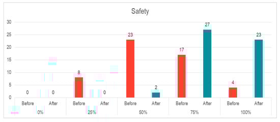 Figure 2. Shows the results of the pre-, and post-test in Safety issues. - Communication: There was an increasing knowledge of communication ways and difficulties after the course. Around 21% (n = 11) of the EPs had none or very little knowledge about communications issues, and 44% (n = 23) had medium knowledge. At the end of the course, there was a shift to the positive end, where the majority of our participants had a good to a very good understanding of safety issues (n = 48, 92%) (Figure 3). The change was statistically significant (p = 0.00, z = −5.872).