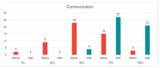 Figure 3. Shows the results of the pre-, and post-test in Communication. - Assessment: There was an increasing knowledge about the importance of the assessment during a major incident after the course. Around 17% (n = 9) of the EPs had no or very little knowledge about assessment and its association with the incident management, and 48% (n = 25) had medium knowledge. At the end of the course, there was a shift to the positive end, where the majority of our participants had a good to a very good understanding of assessment issues (n = 48, 92%) (Figure 4). The change was statistically significant (p = 0.00, z = −5.464).