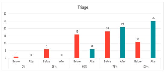 Figure 5. Shows the results of the pre-, and post-test in Triage. - Treatment: There was an increasing knowledge about the treatment alternatives and options at the right time and right place during a major incident after the course. Around 17% (n = 9) of the EPs had none or very little knowledge about the treatment given during incident management, and 28% (n = 15) had medium knowledge. Although 28 EPs reported good or very good knowledge, there was still a shift to the positive end at the end of the course, where the majority of the participants had good to a very good understanding of triage issues (n = 37, 71%) (Figure 6). The change was statistically significant (p = 0.00, z = −5.287).