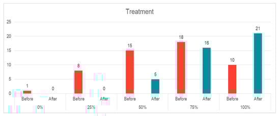 Figure 6. Shows the results of the pre-, and post-test Treatment issues. - Transport: There was an increasing knowledge about the importance of triage and associated dilemmas during a major incident after the course. Around 21% (n = 11) of the EPs had none or very little knowledge about triage and its role during incident management, and 32% (n = 17) had medium knowledge. At the end of the course, there was a shift to the positive end, where the majority of our participants had a good to a very good understanding of assessment issues (n = 38, 73%) (Figure 7). The change was statistically significant (p = 0.00, z = −5.634).