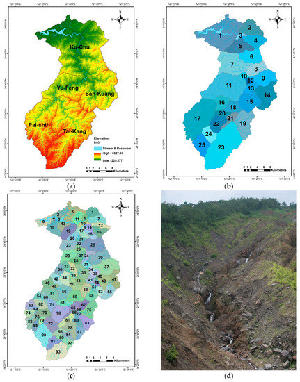 Maps of the Shihmen Reservoir watershed: (a) elevation, (b) 25 sub-watersheds, and (c) 93 sub-watersheds. (d) An illustrative picture of soil erosion.