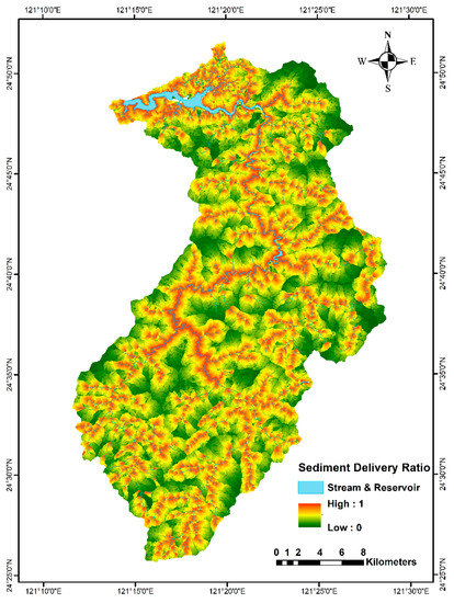 Past studies have shown the distribution of soil erosion of the Shihmen Reservoir watershed, and this paper estimates the geospatially distributed sediment delivery ratio (SDRi) under a beta determined by the recursive method of the SEdiment Delivery Distributed (SEDD) model and a known watershed-wide SDRw.