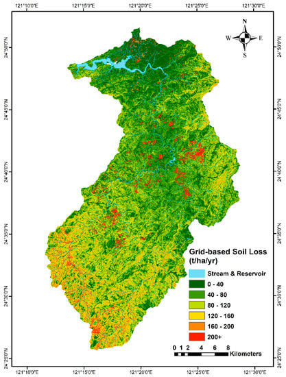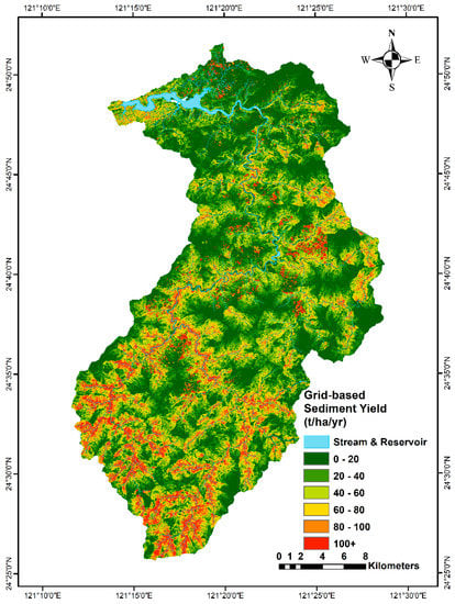 In Figure 5, the SDR of the watershed ranged from 0 to 1, and the areas where sediment delivery has a higher likelihood to reach channels or the outlet is focused mainly around the rivers and streams distributed throughout the watershed. The soil loss evaluation by USLE has been previously discussed in Chen et al. [51] and Liu et al. [16]. This study builds upon the model of Liu et al. [16] by increasing the number of rainfall stations in the analysis of Rm to 41 stations in and around the watershed [38]. Significantly, the SL is 0–40 t/ha/year at the lower elevation in the northern areas of the watershed that surround the reservoir. In contrast, in the southern reaches of the watershed of higher elevations, the SL increases to 80 t/ha/year or more and often exceeding 100 t/ha/year. The delivery to the channel is limited by the SDR, as shown in Figure 5. Therefore, the results of SY in these areas follow the pattern of the SDR with increases around the river channels. The influence of the SDR on SY is evident from visual inspection of the maps.