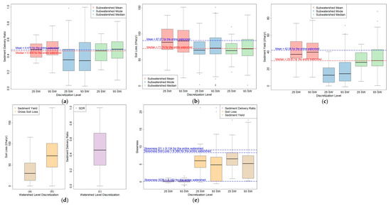 For each sub-watershed, we calculated its mean, median, and mode of SDR, SL, and SY from its distributions. The results were then aggregated into Figure 9 using boxplots. Additionally shown in Figure 9a–c are the mean and median of the entire watershed (horizontal dash lines). Comparing the 25 sub-watersheds with the 93 sub-watersheds, we can see that the range (between the ends of whiskers) of 25 SW is always smaller than that of the 93 SW, no matter what the distribution type is (SDR, SL, or SY). This means that with finer discretization, there is more variation, and it is more likely to obtain extreme values. Interestingly, the interquartile ranges (IQR) of the means of SDR, SL, and SY of 25 SW and 93 SW are about the same. It can also be noted that although the mean values of SDR and SL of 93 SW have broader ranges than those of the 25 SW, the resulting mean values of SY for both the 25 and 93 SW have about the same range. Figure 9d shows the distribution of the watershed level SDR, SL, and SY. Compared with Figure 9b,c, the ranges of the watershed SL and SY are larger than those of both sub-watershed discretizations.