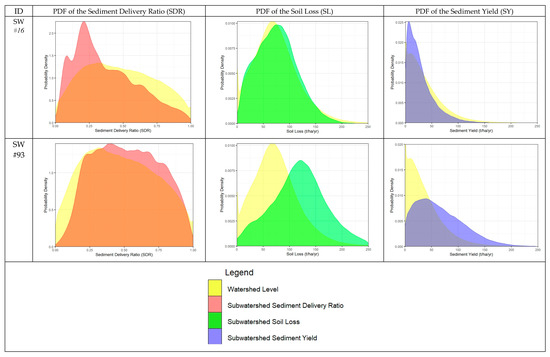 To investigate the mean, median, and mode values by sub-watershed discretization (25 SW and 93 SW) and the correlation of each aspect of sediment yield analysis (SDR, SL, and SY), this study created the boxplots displayed in Figure 9a–e. This study additionally developed the PDF plot of each sub-watershed to investigate similarities and differences between the sub-watersheds—a sample of these plots from the 93 SW are displayed in Figure 10. The variance in the shapes of the probability density functions of SDR, SL, and SY was evident.