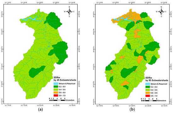 Sub-watershed SDRw of (a) 25 sub-watersheds and (b) 93 sub-watersheds.