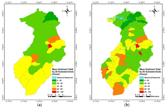 Sub-watershed prioritization by sediment yield of (a) 25 sub-watersheds and (b) 93 sub-watersheds.