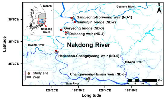 This study was conducted 500 m upstream from the Gangjeong-Goryeong weir (ND-1), Dalseong weir (ND-4), Hapcheon-Changnyeong weir (ND-5), and Changnyeong-Haman weir (ND-6). Water samples were also collected at Samunjin bridge (ND-2; upstream of Dalseong weir) and Goryeong bridge (ND-3; midstream of Dalseong weir) located between the Gangjeong-Goryeong weir and Dalseong weir (Figure 1). These weirs are located in the middle and downstream of the Nakdong River. Sampling was carried out total 11 times from April to October 2018 once or twice a month.