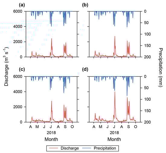 Figure 2. Discharge (m3 s−1) and precipitation (mm) from April to October 2018 at (a) Gangjeong-Goryeong weir; ND-1, (b) Dalseong weir; ND-4, (c) Hapcheon-Changnyeong weir; ND-5, and (d) Changnyeong-Haman weir; ND-6 (Water Environment Information System; http://water.nier.go.kr).