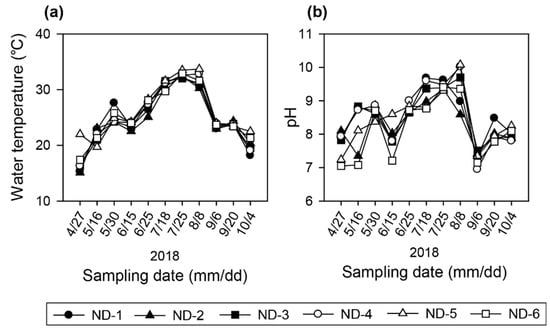 Heavy rainfall was concentrated between late August and early September (total, 376 mm), followed by the period from late June to early July (total, 249 mm) during our study period. This heavy rainfall induced an increase in discharge from all weirs (Figure 2). Water inflow during the study period ranged from 29 m3 s−1 to 1209 m3 s−1 and water discharge through the gate of the weirs ranged from 11.1 m3 s−1 to 1214 m3 s−1 at four study sites in front of the weirs (Table 1). The average water inflow and discharge at ND-6 were 274 ± 320 m3 s−1 and 276 ± 320 m3 s−1, respectively, showing the highest values among the study sites. The distance between ND-5 and ND-6 was the furthest (44 km) compared to the distance between other study sites. HRT ranged from 0 to 32 days, and the average value was lowest on September 6th (1 ± 0.6 days) after heavy rainfall and longest on August 8th (20 ± 9 days) at all study sites. Average LEC at all study sites showed the highest value on September 6th (2.8 ± 0.70 m−1), followed by August 8th (2.7 ± 0.73 m−1) (Table A3). Euphotic depth and secchi depth showed the lowest value on September 6th, followed by August 8th at all study sites. Water temperature ranged from 15.1 to 33.7 °C (Table 1, Figure 3a) and pH ranged from 7.3 to 10 (Table 1, Figure 3b).