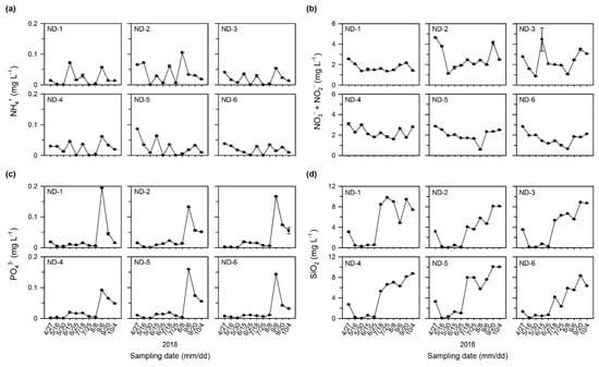 Figure 4. Spatio-temporal variations in concentrations of (a) NH4+, (b) NO3 + NO2, (c) PO43−, and (d) SiO2 in the Nakdong River.