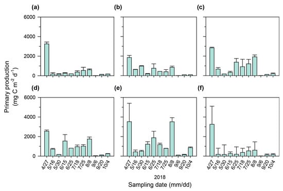 Figure 5. Euphotic depth-integrated primary productivity (primary production) at (a) Gangjeong-Goryeong weir; ND-1, (b) Samunjin bridge; ND-2, (c) Goryeong bridge; ND-3, (d) Dalseong weir; ND-4, (e) Hapcheon-Changnyeong weir; ND-5, and (f) Changnyeong-Haman weir; ND-6.