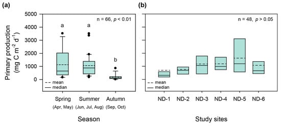Average primary production at all study sites showed the highest value on April 27th (2475 ± 988 mg C m−2 d−1), followed by August 8th (1639 ± 1045 mg C m−2 d−1). Primary production showed the lowest value on September 6th at all study sites, with a range of 9–91 mg C m−2 d−1. Primary production differed significantly depending on the season (p < 0.01) (Figure 6a). It was significantly high in spring (p < 0.01) and summer (p < 0.01) compared to autumn. There was spatial variation in primary production, except in autumn, which showed a significant seasonal difference (Figure 6b). Primary production was not significantly different among the study sites in spring and summer (p > 0.05).
