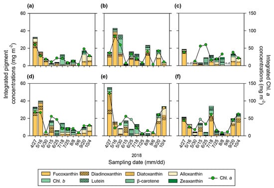Figure 7. Euphotic depth-integrated Chl. a and accessory pigment concentrations (mg m−2) at (a) Gangjeong-Goryeong weir; ND-1, (b) Samunjin bridge; ND-2, (c) Goryeong bridge; ND-3, (d) Dalseong weir; ND-4, (e) Hapcheon-Changnyeong weir; ND-5, and (f) Changnyeong-Haman weir; ND-6.