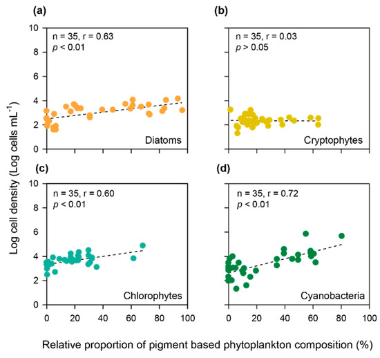 Figure 8. Relationships between relative proportion of pigment-based phytoplankton composition (%) calculated by the CHEMTAX program and Log cell density (Log cells mL−1) for (a) diatoms, (b) cryptophytes, (c) chlorophytes, and (d) cyanobacteria.