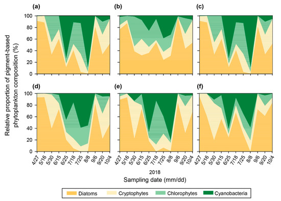 The results calculated by the CHEMTAX program did not differ among the study sites (p > 0.05). Significant seasonal variations in relative proportion of pigment-based phytoplankton composition were observed in diatoms (p < 0.01), cryptophytes (p < 0.05), chlorophytes (p < 0.01), and cyanobacteria (p < 0.01). During the study period, Aulacoseira sp., Cryptomonas sp., Eudorina sp., and Microcystis sp. were dominant species in diatoms, cryptophytes, chlorophytes, and cyanobacteria, respectively [36,37]. The relative proportion of pigment-based diatoms ranged from 0 to 96% (46 ± 32%), cryptophytes from 2 to 64% (20 ± 16%), chlorophytes from 0 to 76% (17 ± 18%), and cyanobacteria from 0 to 88% (17 ± 24%) (Figure 9). The relative proportion of diatoms in summer was significantly different from those in spring and autumn (p < 0.01), but significant differences were not found between spring and autumn (p > 0.05). The relative proportion of diatoms was high from April 27th (89 ± 6.4%) to June 15th (52 ± 23%). It decreased to 5.5 ± 13% on August 8th, and they dominated again on September 6th, with a value of 85 ± 9.3%. The relative proportion of pigment-based cryptophytes was high on May 30th (41 ± 24%), followed by September 20th (36 ± 24%). It was significantly different in summer and autumn (p < 0.01). The relative proportion of pigment-based chlorophytes and cyanobacteria in summer were significantly different from those in spring and autumn (p < 0.01, respectively). The proportion of chlorophytes was low on April 27th (3.4 ± 5.5%) and started to increase in summer. It was the highest on July 18th (49 ± 24%) and then decreased after summer. Seasonal variations in cyanobacteria proportion were similar to those observed for chlorophytes. Cyanobacteria were not measured from April 27th to May 16th, were detected for the first time on May 30th (5.9 ± 6.1%), and largely dominated on August 8th (61 ± 20%).