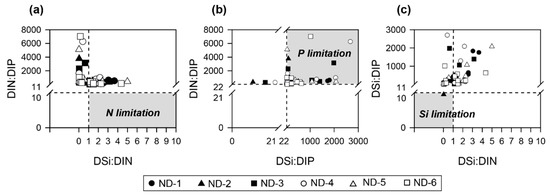 Figure 11. Assessment of (a) nitrogen limitation, (b) phosphate limitation, and (c) silicate limitation at all study sites using the criteria of nutrient ratios suggested by Justic et al. [44].