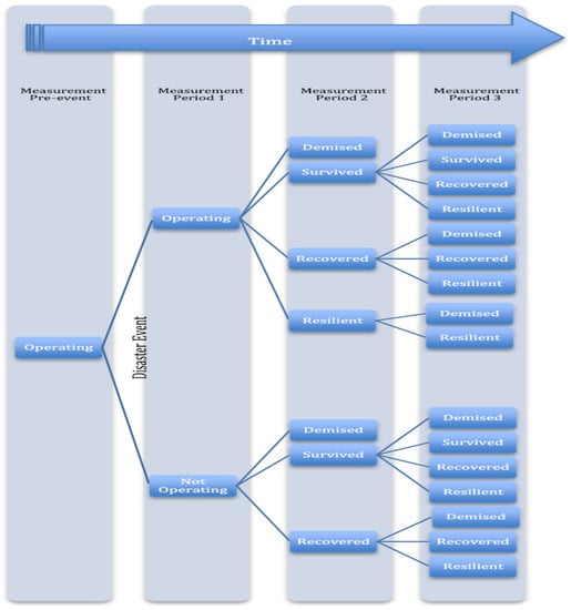 Much of the literature reviewed here addresses demise and survival in a dichotomous manner, however, it is clear that businesses that never reopen differ in key ways from those that reopen but ultimately do not survive. In addition, there is also evidence that those businesses that do resume operations after a natural disaster do not necessarily recover fully [15]. To better address what contributes to business sustainability, a non-dichotomous assessment of “recovery” is needed. Marshall and Schrank proposed a small business disaster recovery (SBDR) framework (Figure 2) that includes four categories of business operating status: demised, survived, recovered, and resilient and these may be assessed over time [61]. These categories offer insights into the recovery period and its characteristics that go beyond those of the initial post-disaster assessment. Permanent closure of a previously operating business is defined as “demise”, distinguishing it from” non-operating” which may be temporary (such as rebuilding or not operating because lifeline utilities are not restored). In the framework, “survival” refers generally to the status of an operating business (as opposed to demised business), but specifically to those businesses that were operating at a reduced capacity in terms of revenues. The term “recovered” was applied to businesses that were operating with revenues at a similar level to what they generated prior to the natural disaster. “Resilient” businesses were defined as those operating businesses that had exceeded their pre-disaster status and had taken additional steps to reduce their exposure to future events.