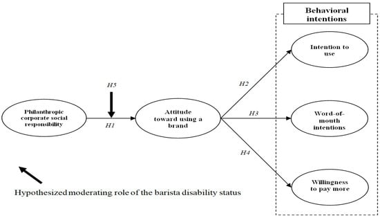 Following the growing CSR activities in the service industry, scholars began to test the impact of these CSR practices on consumers’ responses [18,19,20]. Attitude has been one of the popular constructs as a result of CSR programs, and CSR was examined as one of the crucial predictors of consumer attitude toward a certain company or a brand [19,20,21,22,23]. These researchers articulated a significant link between social initiatives and positive affective and cognitive responses (i.e., attitude). For example, companies initiating various CSR programs were perceived as more compassionate, more ethical, trustworthy and warmer [18,19,21]. That is, studies have provided the sufficient evidence that a company’s CSR practices improve brand evaluation and corporate image. More importantly, engaging in PCSR was proven to be beneficial to create more favorable consumer attitude towards using a brand in many studies [13,19,20]. On the other hand, attitude toward using a brand has been found to be a strong indicator of consumers’ behavioral intentions (i.e., intentions to use, word-of-mouth intentions, and willingness to pay more) [19,24,25]. In this regard, our study aimed to test the influence of PCSR on consumer attitude toward using a brand and, subsequently, on behavioral intentions in the coffee industry context. Additionally, the current research focused on barista disability status in light of limited evidence in the existing literature despite the attempts at identifying the moderating impact of disability status in other settings [26,27].