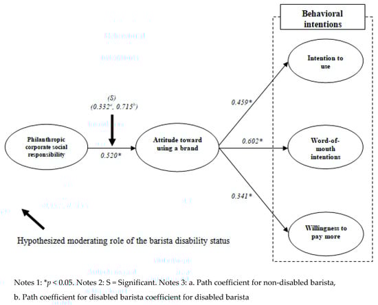 In order to test the moderating role of the barista disability status, the current study employed multiple-group analyses by comparing the chi-square difference between the unconstrained and constrained models based on the difference in degrees of freedom [75]. The results of the multiple-group analyses showed that the barista disability status moderated the relationship between PCSR and attitude (Δχ2 = 8.011 > χ2 = 0.5(1) = 3.84, df = 1), which supported Hypothesis 5. More specifically, the path coefficients for the disabled barista group (β = 0.715, p < 0.05) were found to be higher than for the non-disabled barista group (β = 0.332, p < 0.05). Figure 2 shows the results of the multiple-group analyses.