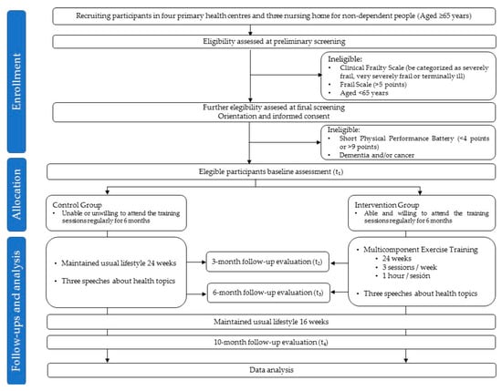 Recruitment and screening were performed between June and December 2018. Four primary care health centers and three nursing homes for non-dependent people of the city of Zaragoza (Spain) collaborated in the recruitment after a previous meeting with the principal investigator in which all the project information was provided. Medical doctors, nurses and heads of residences encouraged potential candidates to participate and performed a preliminary screening of volunteers based on the clinical frailty scale [38] and frail scale [59]. After that, researchers contacted eligible participants to undergo the final screening and the initial interview to collect personal data, in which volunteers received detailed information of the study and signed the informed consent document. The screening was based on the cut offs of the short physical performance battery (SPPB) for frail (4 ≥ SPPB points ≤ 6) and pre-frail (7 ≥ SPPB score points ≤ 9) individuals [60,61]. The exclusion criteria were: to be younger than 65 years, to have been diagnosed with dementia and/or cancer and to be dependent or robust (SPPB score less than 6 or greater than 9).
