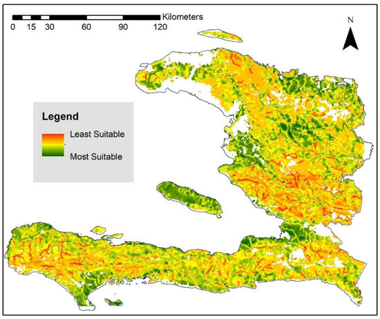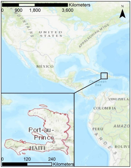 Using Haiti as a case study, this paper demonstrates the decision process developed to identify optimal, safe locations for shelters following a disaster event. The study area, shown in Figure 1, was chosen to simulate the framework’s applicability in a developing country with high disaster risk whose resilience has been impacted by its lack of resources for effective disaster risk management. High-quality data is typically not available in low-resource communities such as Haiti. Haiti has been continually devastated by multiple types of disasters due to natural hazards throughout history including earthquakes, floods, landslides, and hurricanes [47].