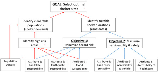 Shelter allocation is a critical component of disaster risk management [8] that low-income nations do not have adequate resources to plan effectively [7]. Effective shelter allocation requires integrated assessment of multiple hazards, as well as infrastructural and non-infrastructural elements [9]. Because low-income nations often do not have the resources for information management to make informed shelter planning decisions, shelters may fail to meet the needs of the population [10,11]. The shelter allocation process varies by government policymaker and aid organization [9], but common practices in shelter allocation suffer from several drawbacks that may hinder recovery [8,9]. One drawback is that disaster risk management is often approached through a top-down structure that neglects community participation and local needs [12]. Another is that a segmented approach is often taken to disaster risk management [13]. This work addresses these two common shortcomings of disaster risk management with respect to shelter site planning for natural hazard events.