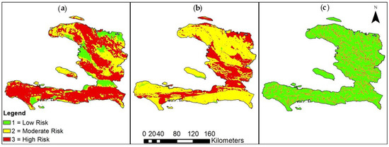 Landslide classes were estimated from NASA’s predetermined susceptibility classes, which were established considering topography (slope), seismicity (distance to faults and geological classification), presence of roads, and forest loss [49]. The original global landslide susceptibility map was classified using fuzzy logic to develop a 1–5 scale of very low to very high susceptibility. This was standardized to be conservative of risk, the result shown in Figure 3a.