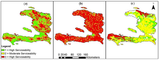 Standardized attribute maps for the objective to maximize serviceability (Objective 2): (a) Reclassified road density to accessibility by vehicle transport; (b) reclassified healthcare facility density to accessibility to healthcare; (c) reclassified land cover to suitability/serviceability of site land cover.