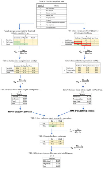 Through the WLC method, an AHP employs a global method for constructing a priority rating [26]. The WLC model relies on the assumption that attributes are mutually preference independent. Even though this assumption can be problematic in complex spatial problems, this method is generally well accepted in practice [60,61]. It allows for consideration of preferences of multiple decision-makers, which is beneficial because it creates a platform for collaboration between different stakeholders that do not always share political or social initiative. Engaging with stakeholders is important to ensure that disaster planning considers the needs of all affected and relevant parties, including members of vulnerable populations, experts, and governments [5,16,62]. Through the WLC method, criteria are weighted by pairwise comparison. Each pair is compared on a scale of 1 to 9 (Figure 5, Table A) in which the user ranks their preference of one, k, over the other, p [38,63]. A value of 1 signifies equal preference and 9 signifies that criterion k is of extremely greater importance than criterion p. The pairwise comparison values are organized into a matrix where the value ckp, the preference of k over p, is the reciprocal of cpk, the preference of p over k. The user-defined pairwise comparison matrices for this scenario are shown in Table B and C of Figure 5. For example, the value of 2 (see highlighted in Figure 5, Table C) means that, according to the decision-maker, maximizing accessibility by vehicle transportation at a shelter location is slightly more important than maximizing access to healthcare facilities. The highlighted value of 1/5 means that maximizing accessibility by transportation, attribute p, has strong importance over maximizing land cover utility, attribute k, at a shelter location. For that reason, the value of ckp is less than one, calculated as the reciprocal of the preference value given to p over k, or cpk. In this scenario, all three hazards in consideration are assigned equal weight, represented by values of 1 in the matrix. This was chosen to show the conservative scenario that must meet equal risk requirements for each hazard in consideration. This process is performed separately to compare criteria for each objective, and then the criteria themselves are weighted against one another, in accordance with the hierarchy. The values in Table B and C (Figure 5) are standardized according to the equation shown for . The standardized values for this scenario are displayed in Table D and E of Figure 5. The weight given to criterion k is calculated according to the equation shown for wk, where n is the number of criteria. The scenario-based criteria weights, wk, are applied to the value function of each attribute k as the combination rule (Figure 5, Table F and G). These weighted value functions measure the success of their corresponding objective at each alternative site; the result corresponds to the second level from the bottom of the hierarchy in Figure 2. The same process is applied to those results, as displayed in Table H, I, and J, to evaluate overall suitability at each alternative. Like the criteria, the objectives are weighted according to decision-maker preference and aggregated. The result corresponds to the box titled “Select Suitable Sites” in Figure 2. In this scenario, minimizing hazard risk is slightly more important to the user than maximizing serviceability at shelter sites, signified by a value of 2 for ckp, where k is Objective 1, and p is Objective 2. The AHP structure combined with the WLC incorporation of user preference allows decision-makers to adjust to their limitations: For example, if funding and resources are no issue, the decision-maker may give strong preference to the “minimize hazard risk” objective because they are confident in the ability to build field hospitals, provide alternate forms of transportation for displaced persons, and supply imports.