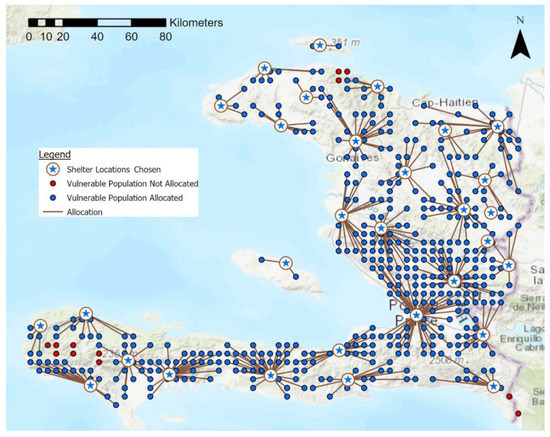 Figure 8 shows the results of the second stage, location-allocation analysis for the demonstrated scenario: The recommended shelter sites and allocation of vulnerable populations to the shelter sites. Thirty shelters were selected, serving 97.5% of the demand. This scenario was country-wide and focused on major shelter location.