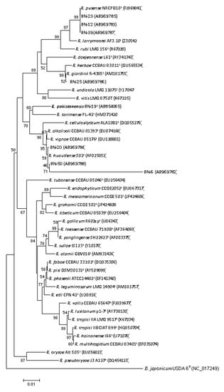 - Khalid, R.; Zhang, Y.J.; Ali, S.; Sui, X.H.; Zhang, X.X.; Amara, U.; Chen, W.X.; Hayat, R. Rhizobium pakistanensis sp. nov., isolated from groundnut (Arachis hypogaea) nodules grown in rainfed Pothwar, Pakistan. Antonie Van Leeuwenhoek 2015, 107, 281–290. [Google Scholar]