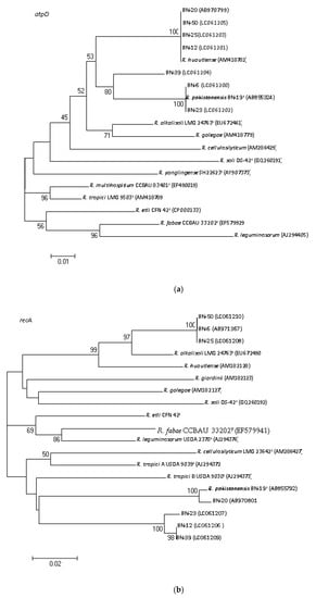 - Gaunt, M.W.; Turner, S.L.; Rigottier-Gois, L.; Lloyd-Macgilp, S.A.; Young, J.P. Phylogenies of atpD and recA support the small subunit rRNA-based classification of rhizobia. Int. J. Syst. Evol. Microbiol. 2001, 51, 2037–2048. [Google Scholar]