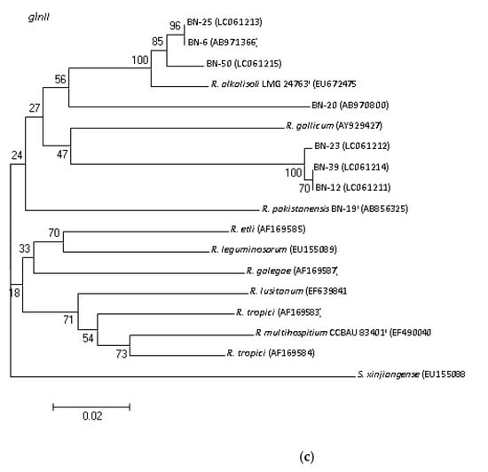 For housekeeping genes (atpD, recA, glnII) of the Rhizobium sp., sequences were obtained from NCBI GenBank, and neighbor-joining trees clarifying the positions of each strain in the genus Rhizobium were constructed (Figure 2).