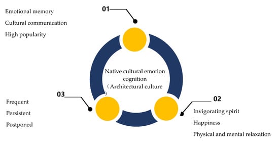 - Emotional image: Emotional image cognition is a process in information processing. After the initial observation of a real thing, the cognition of different emotion images is combined by comparing and thinking of different types of knowledge and experience structures stored in the individual’s brain [42]. From the perspective of cognitive psychology, the designer analyzes the emotional expressions embodied in the 19 buildings, such as the three different emotions of invigorating spirit, happiness, and physical and mental relaxation. Invigorating spirit: This means the mood and feeling at the time of visiting the building is very exciting. Happiness: The feeling at the time of visiting the building is a very happy feeling. Physical and mental relaxation: The feeling at the time of visiting the building is relaxing both physically and mentally.